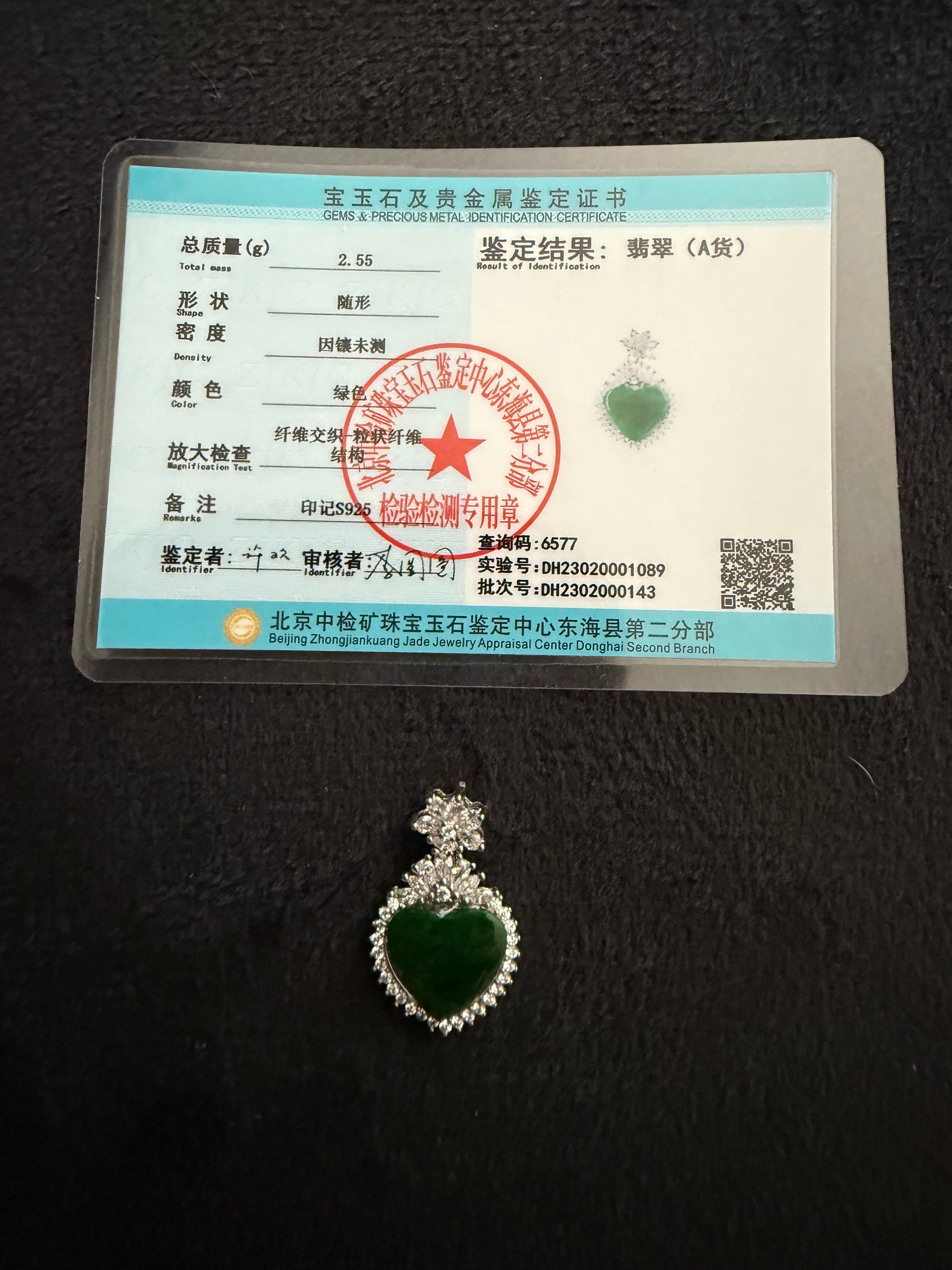 Burmese Jade Heart Pendant with Rhinestones in Sterling Silver
