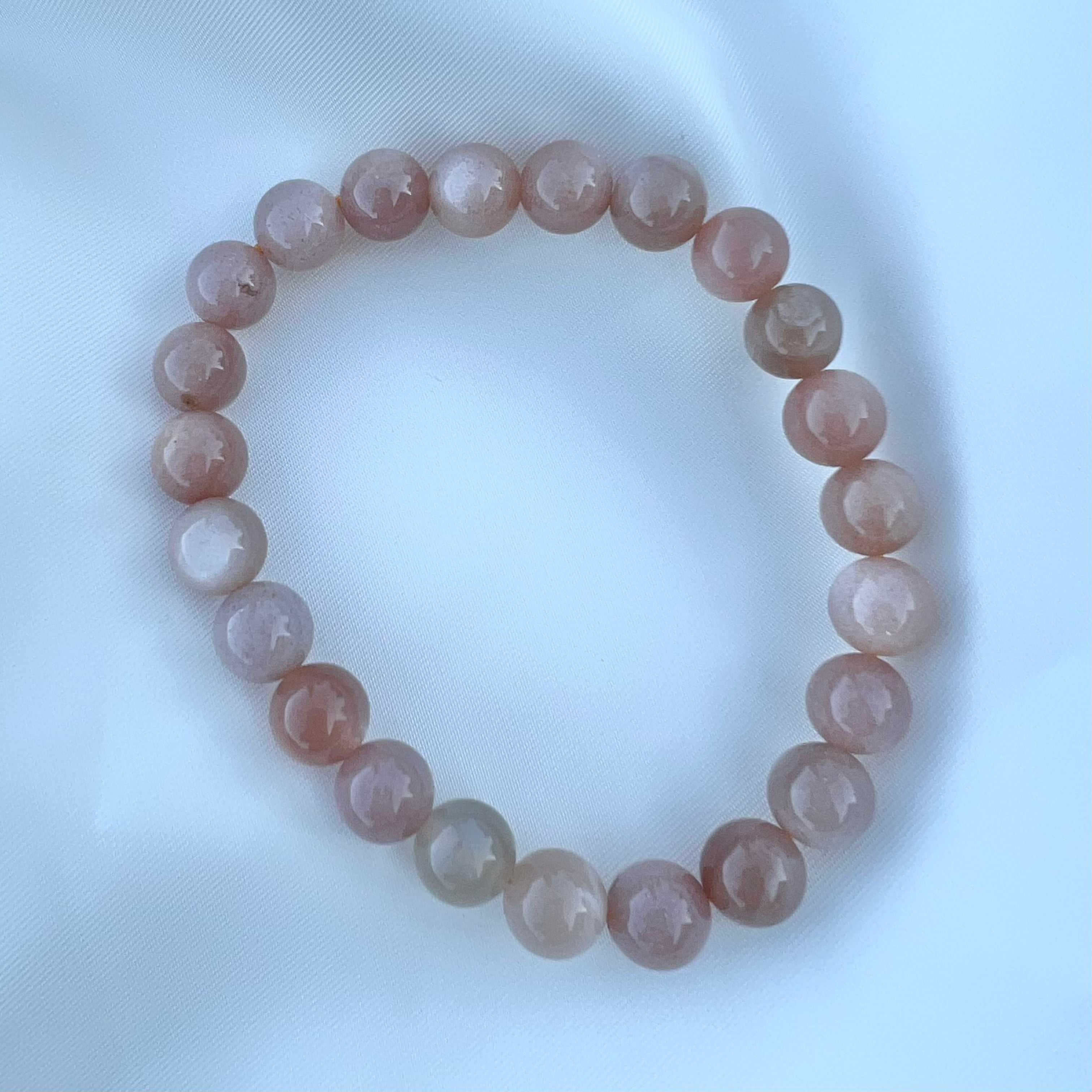 Peach moonstone bracelet with elastic cord. Please note the color of the stones will vary between each bracelet. 8mm size.