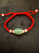 Featuring a genuine Burmese jadeite centerpiece, this bracelet is strung on a vibrant red adjustable cord symbolizing luck and protection. The adjustable design ensures a comfortable fit for any wrist, making it a meaningful accessory for everyday wear.