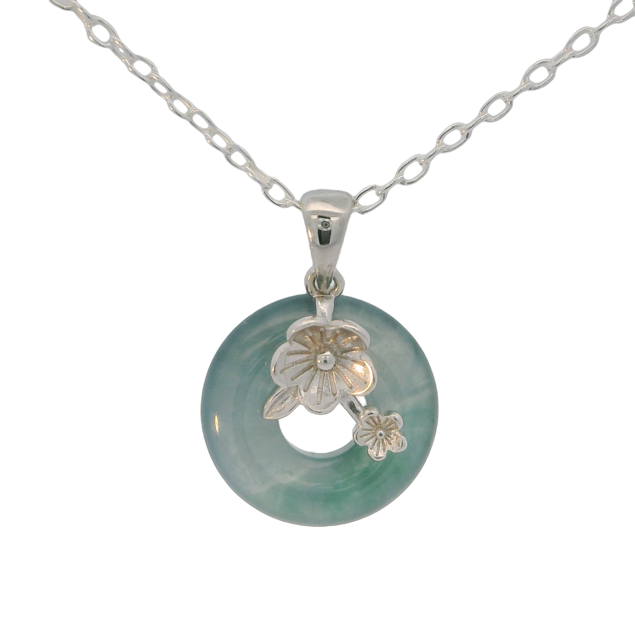 This exquisite pendant necklace features a stunning jade circle adorned with delicate silver floral accents. The elegant design is suspended from a fine, silver chain, making it the perfect accessory for any ensemble.