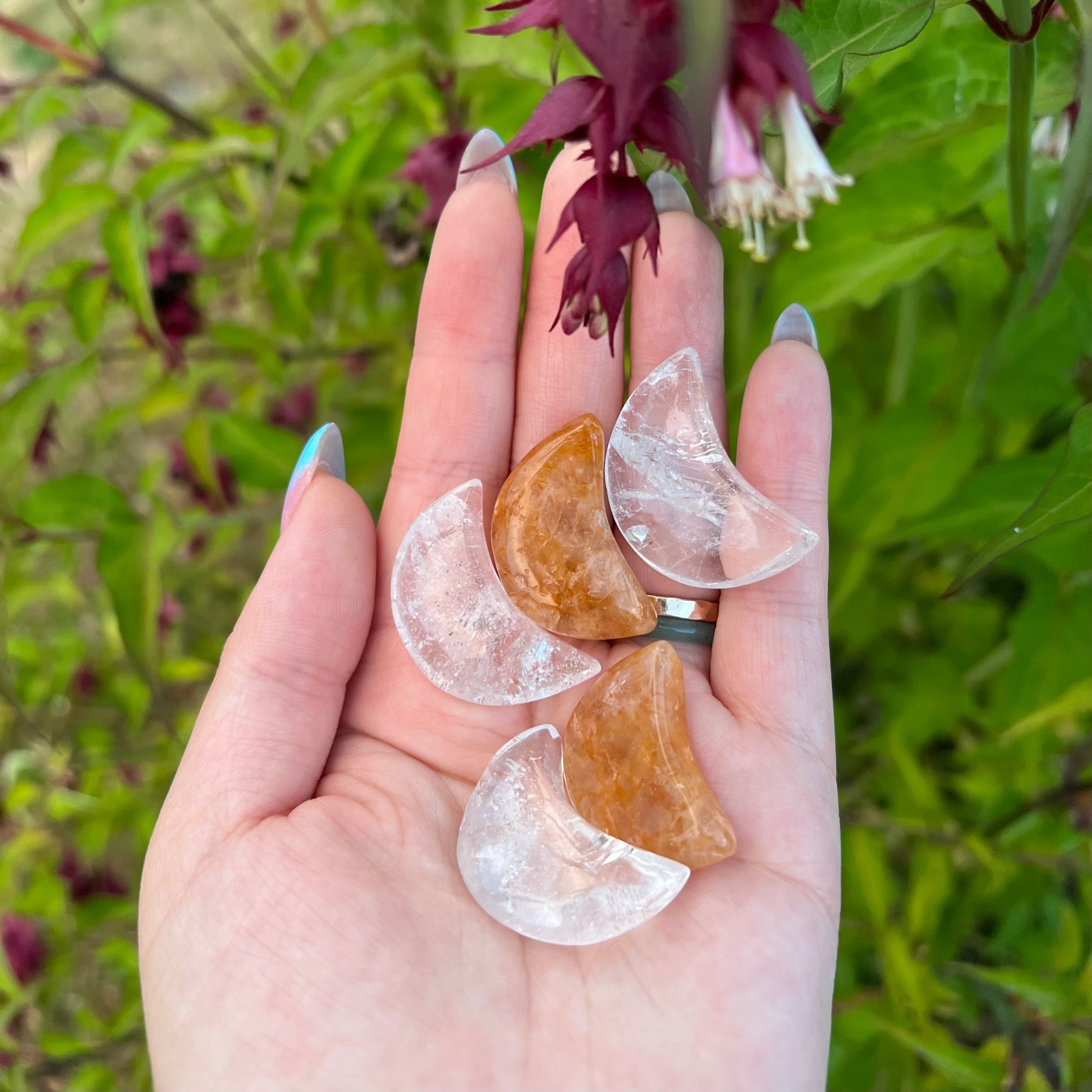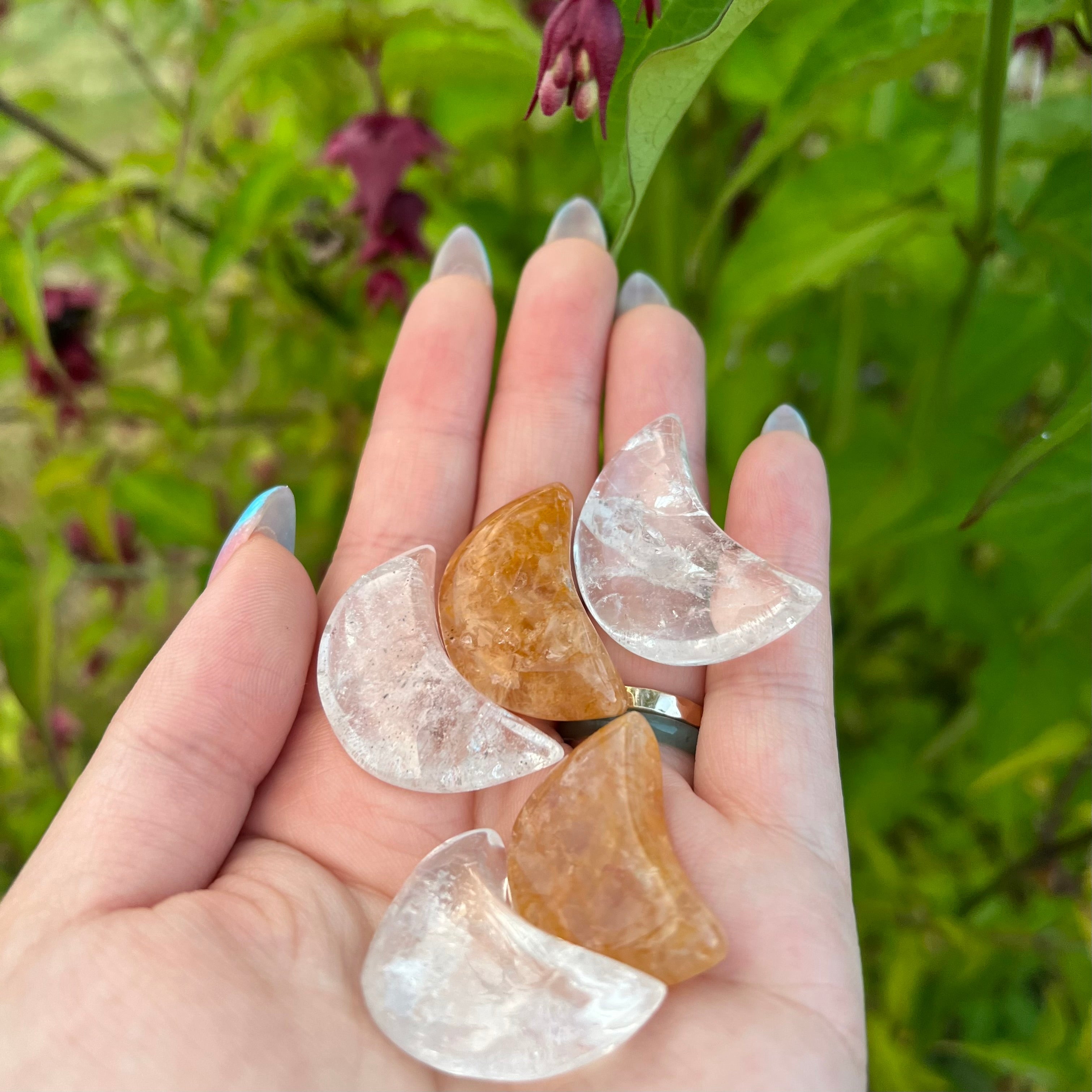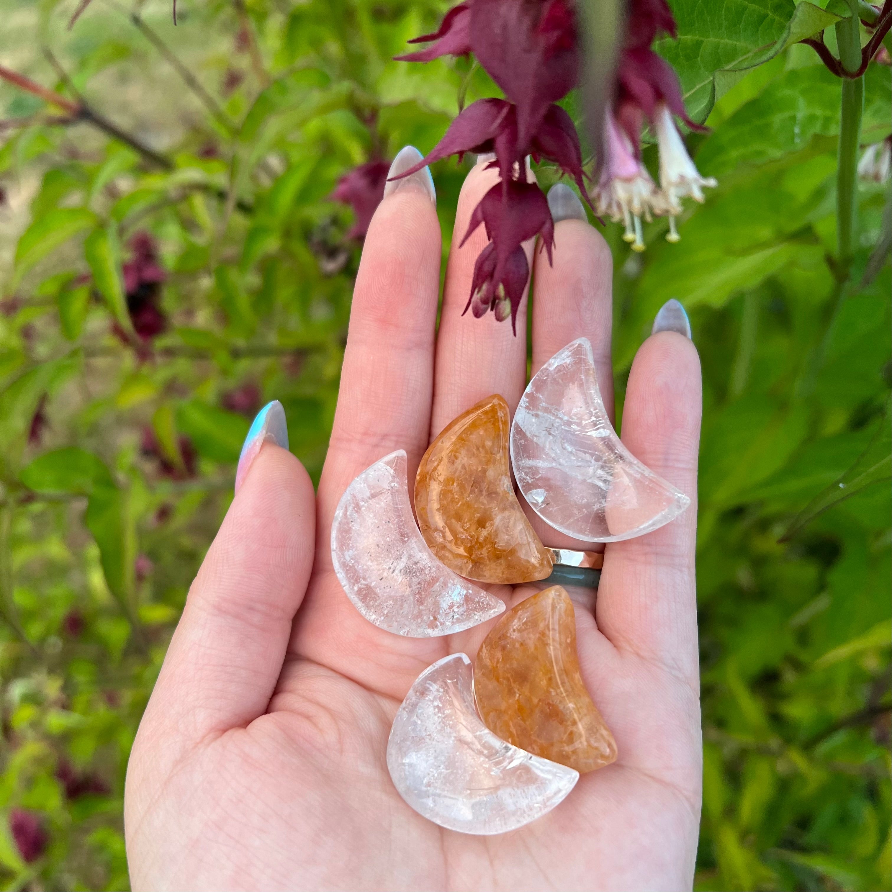 Choose between clear quartz or golden healer moon. In the picture, the clear quartz is the white/clear colored crystal and the golden healer is the orange/yellow moon.